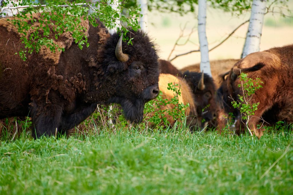 Әне-міне дегенше, бизондардың да қарасы көрінді. Шоқ-шоқ қайың тоғайлар арасындағы ашық алаңда, күншығысқа қарай желдеп жайылып барады. Парктің ресми сайтындағы мәлімет бойынша, 2020 жылы бұл жерге 10 бас бизон әкелінген. Содан бері біршама көбейіп қалған сияқты. Ә, дегенде 20 бас бар-ау деп шамаладық.