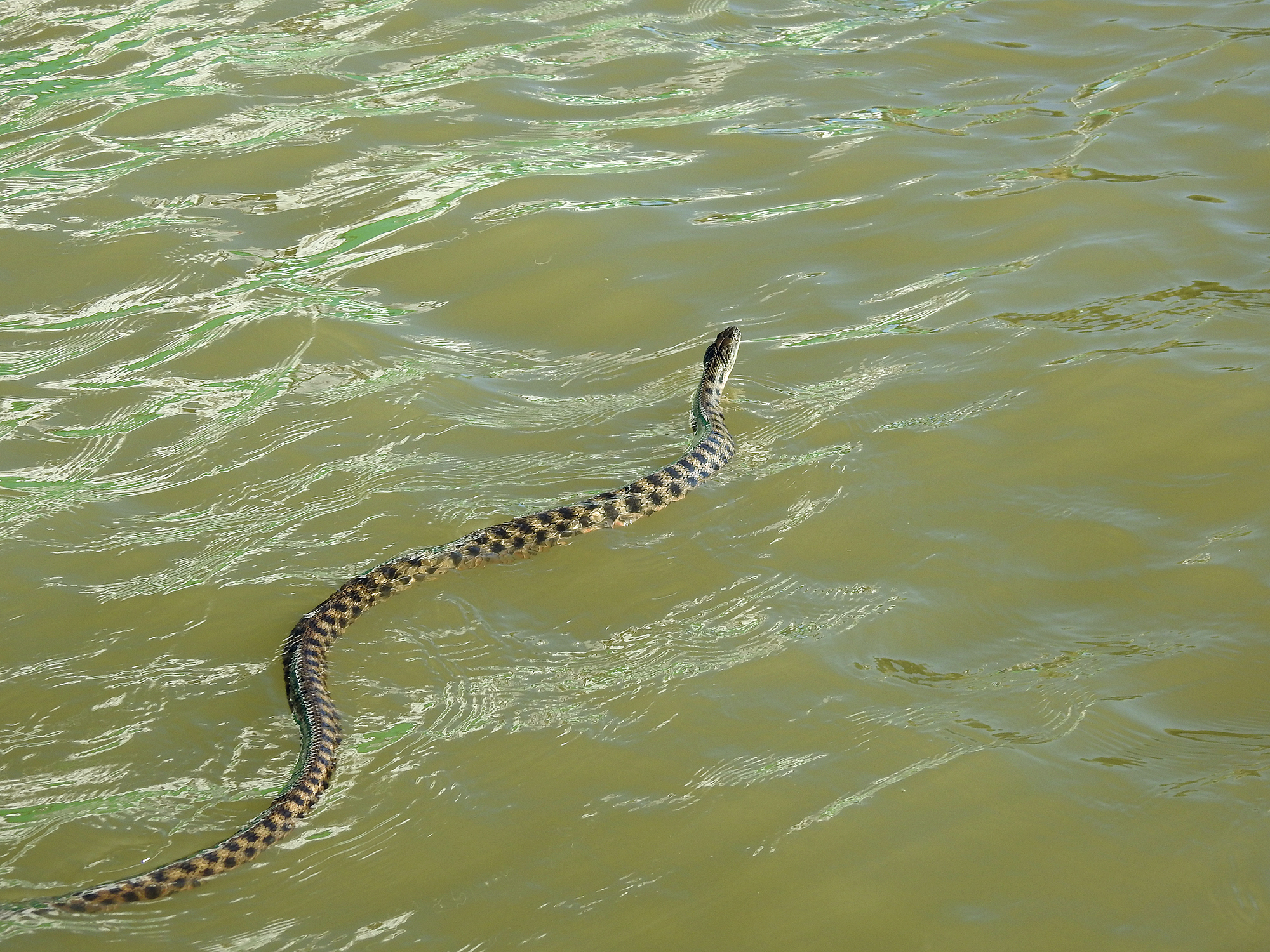 Қайығымызға қатарласа бір жылан жүзіп бара жатты! Тобымыздағылар бұған алуан түрлі реакция білдірді: бірі қорқып қалса, бірі қызыға тамашалап тұрды. Ал мен, әдеттегіше, фотоаппаратыма жармасып, бауырымен жорғалаушыны суретке түсіре бастадым. Мұндай сәт үнемі туа бермейді, жанымызда жүзіп бара жатқан жыланды күн сайын көре бермейміз! Оның сырт пішініне мұқият зер салып, жоны шахмат тақтасын еске түсіретін қара-сұр түсті екенін байқадық. Біздің жанымызда уытсыз бауырымен жорғалаушы — сужылан (Natrix tessellata) жүзіп бара жатқаны сонда ғана түсінікті болды.