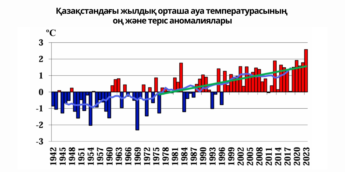 Қазгидрометтің дерегінше, кейінгі 30 жылда Қазақстанда орташа жылдық температура +1°C өскен. Салалық ғылыми қызмет 2050 жылға дейін бұл көрсеткіш +2,4°C-ға жетуі мүмкін деп болжайды.